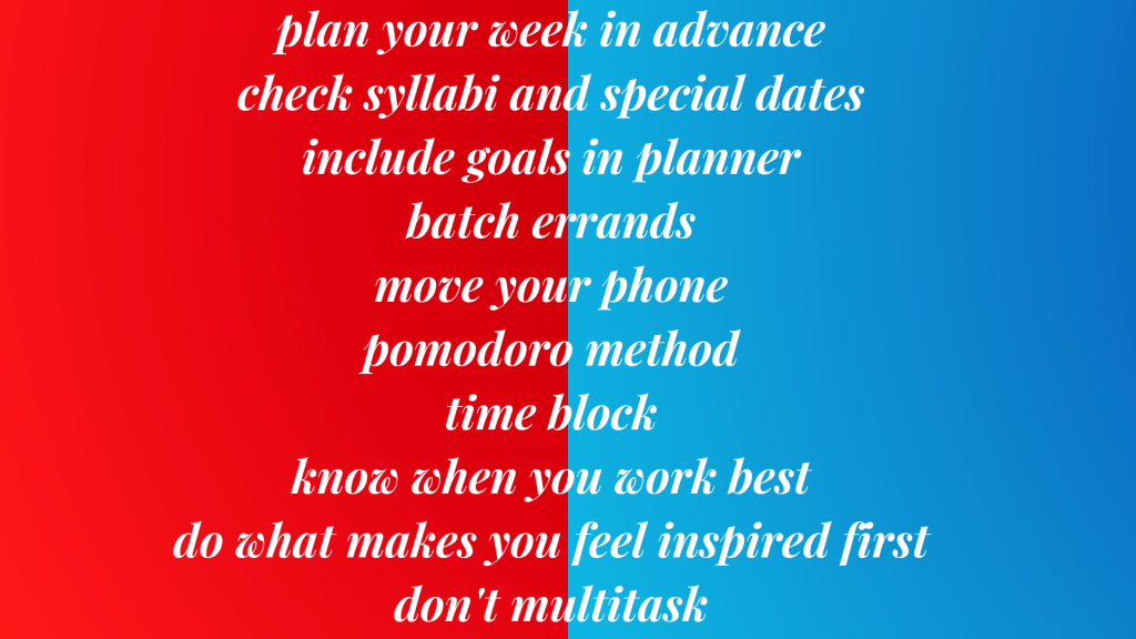 Often we can lose motivation and steam when we are switching between tasks. Even going back and forth between tabs on your computer screen makes you less productive. When your focus is divided, you are less efficient and less productive. Make sure you do the same type of tasks together. If you need to write a proposal and write a paper, write them in the same time span. If you need to clean your room and do laundry, do that together. Do similar tasks together for the most efficiency.