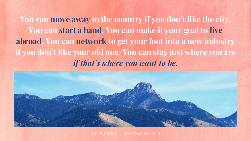 Maybe after college, you’ll work in the corporate world, learning to hone your skills and about the typical environment. If that doesn’t work for you, perhaps you work for a startup with good work-life balance. You can move away to the country if you don’t like the city. You can start a band. You can make it your goal to live abroad. You can network to get your foot into a new industry if you don’t like your old one. You can stay just where you are if that’s where you want to be.