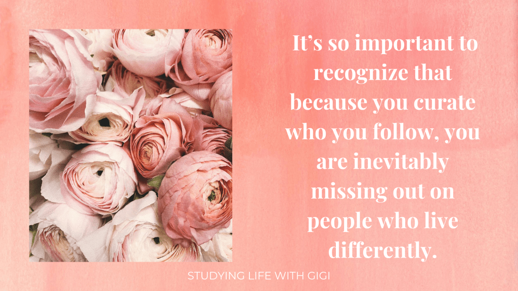 Social media can make you feel as if hustle culture and moving to a big city after graduation and going out all night on the weekends are the only ways to live a happy life. It’s so important to recognize that because you curate who you follow, you are inevitably missing out on people who live differently.