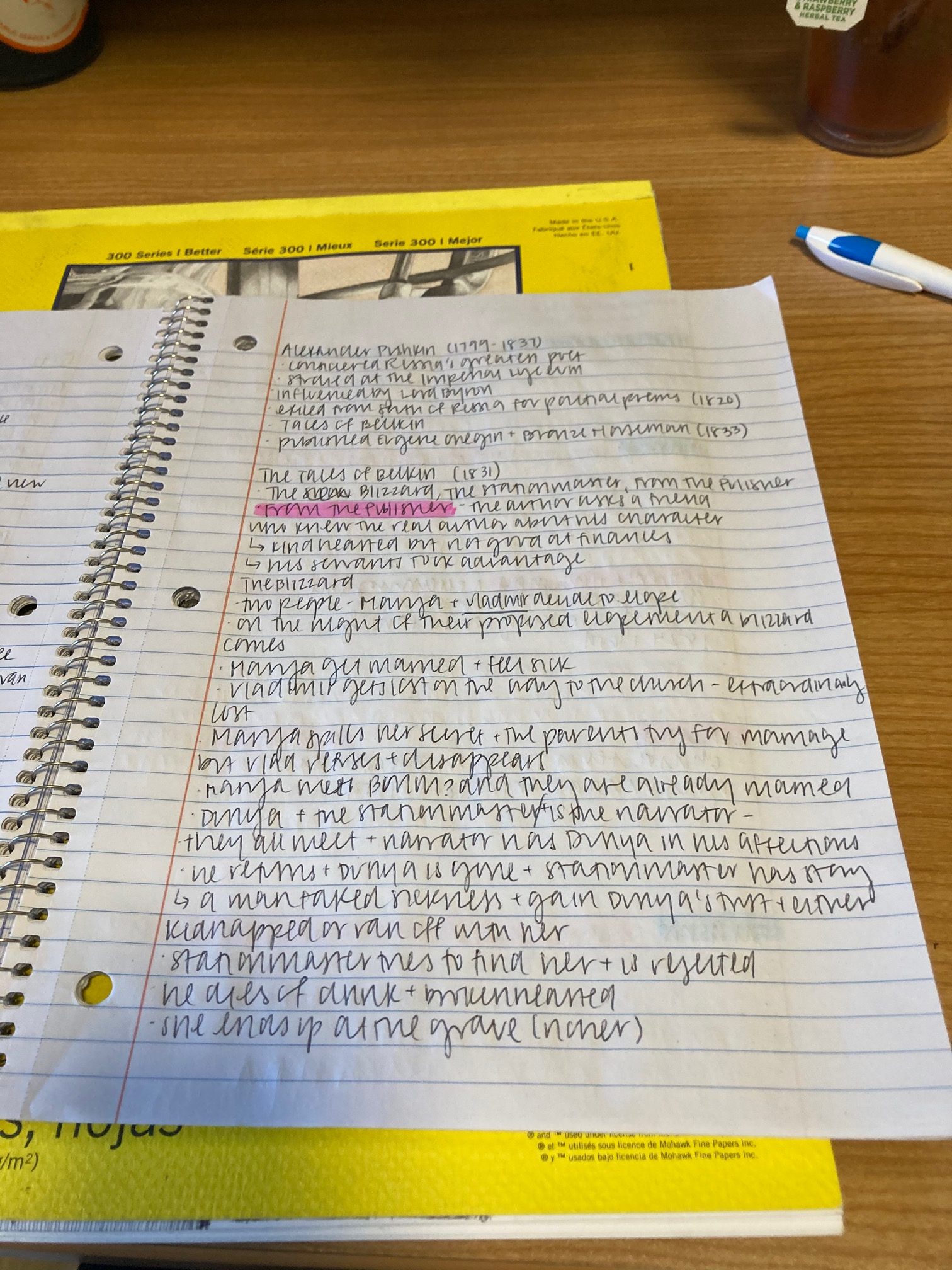Then ‘twas back to studying. Looking over all the stories we’ve read – Poor Liza, The Tales of Belkin The Publisher, The Blizzard, The Stationmaster, The Bronze Horseman, God grant that I not lose my mind, Viy, Diary of a madman, andThe Overcoat. Lots of people to remember – Nikolai Karamzin (1776-1826), Alexander Pushkin (1799-1837). Nikolai Gogol (1809-1852), Petr Chaadev (1794-1856), and Peter I (1682-1725). It’s all good.