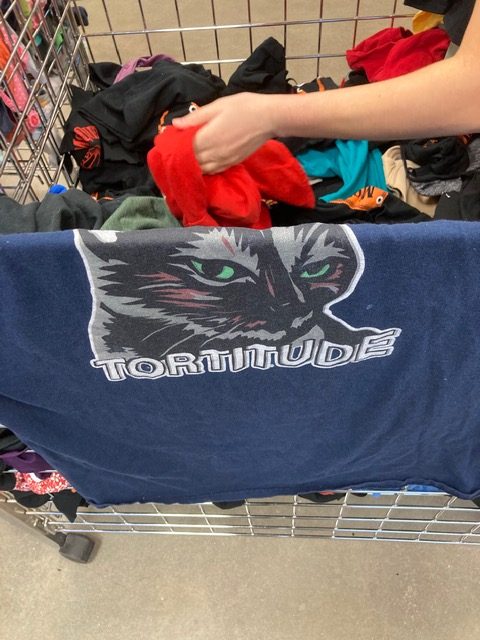 After trying (and failing) to do my art project, a friend and I headed to a thrift store. This Goodwill was tiny, but I did end up with 2 cat shirts. One for my twin brother and one for myself. If there ever was a good find at a thrift store, cat shirts are it!