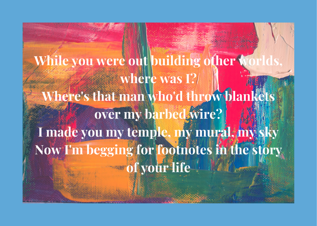 I miss A Fine Frenzy so much. Her first album is absolutely incredible, and this song reminds me of an old middle school crush. The imagery is stunning and it brings me such nostalgia. Do you have anyone from the past that comes to mind from time to time? That’s what this song is about.