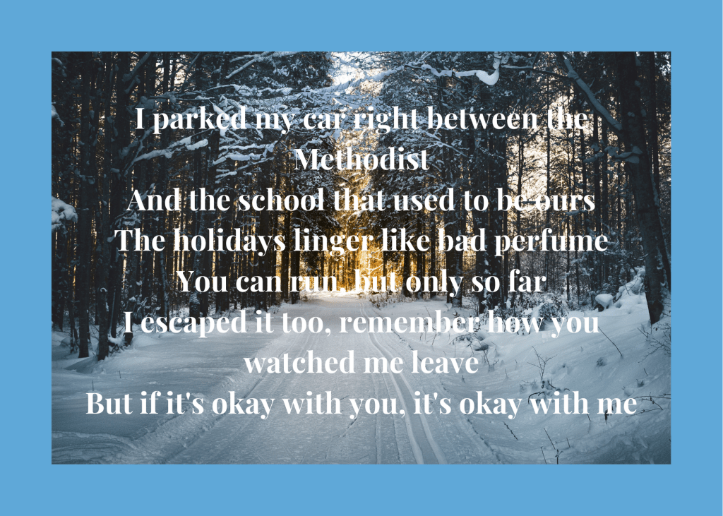 The winter song of the year is tis the damn season. It’s catchy. There’s a Robert Frost reference for us American kids. Your hometown friends see a side of you that your college friends don’t see. Growing up with no clear direction but unlimited dreams, this song feels like feeling the weight of real life and wanting to go back to before when life was simpler.