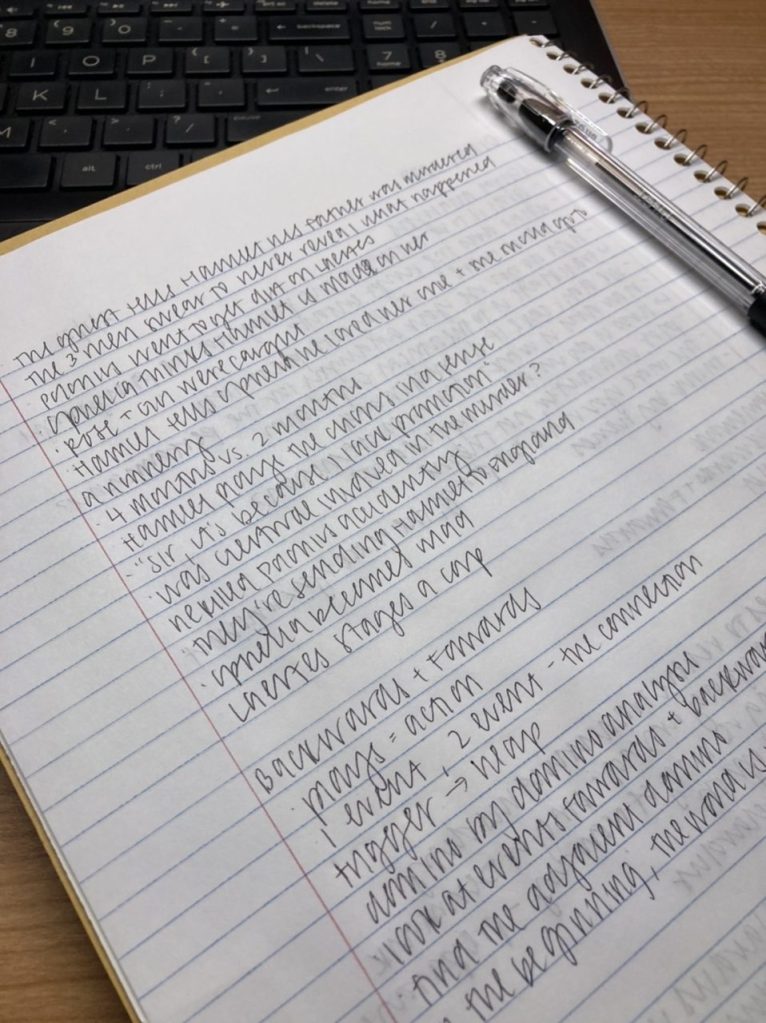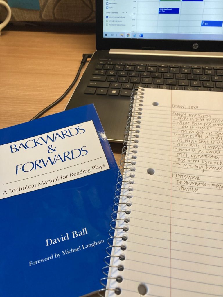 I read both Hamlet and Backwards and Forwards. Ooh, I’m putting that on my Goodreads account. Some random things to take note: characters don’t change in plays, according to the author, their circumstances or attitudes do; each moment is a trigger and an action; theme is the thing that comes last during a script analysis; picking at the tension is how the playwright keeps an audience.