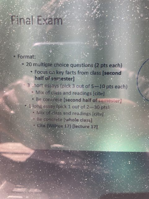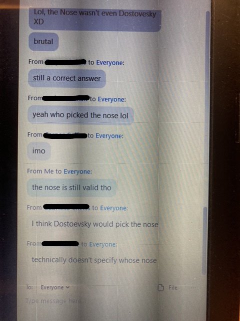 My last class of the year was Dostoevsky. The chat was the liveliest I had seen it ALL semester long, and it was again bittersweet. I wish I got to meet some people in that class in person *wink wink* Big side note: winking was a big deal in Crime and Punishment. Seriously, if I had a penny for every time Porfiry winked, I wouldn’t be rich, but you get the point.