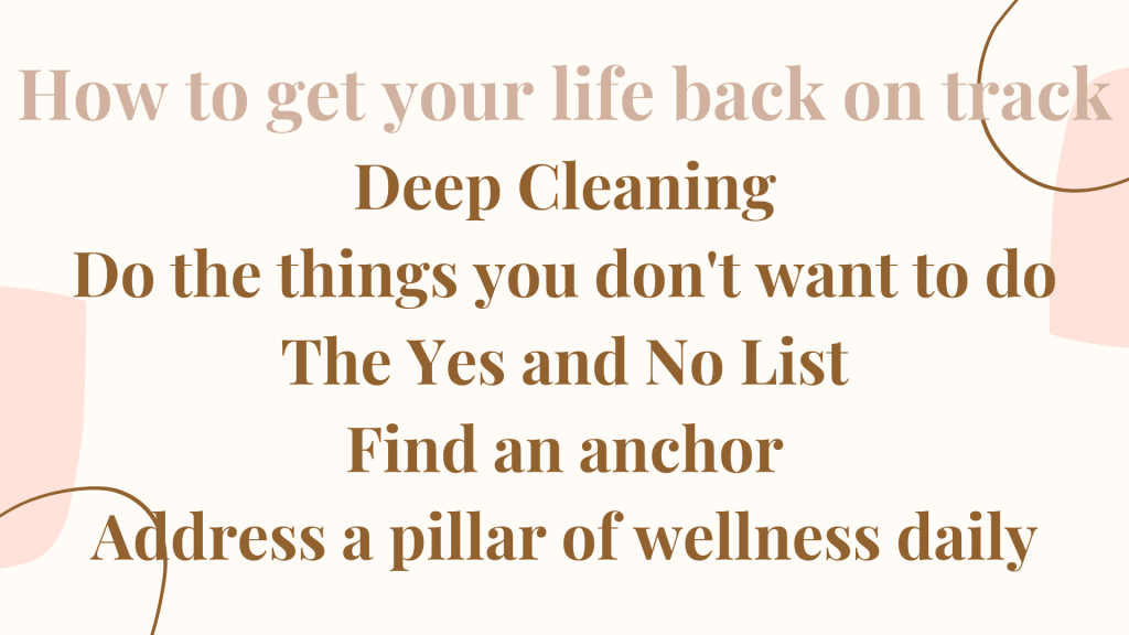 There are (at least, in my mind) 5 pillars of wellness. Physical. Emotional. Spiritual. Mental. Social. When we care for these aspects of our lives consistently, we are our best selves. We’re reflective, we’re healthy, we’re firm in our character. Do one thing a day to address one pillar. Maybe one day you go for a long walk. Next you spend time journaling. Then you spend time in silence. Next, you read a good book. You hang out with your friends. It’s good to start with one a day. But usually without noticing it, you could be addressing several categories in one day. As long as you’re living in line with your Yes and No list, make an action plan and get back on track!
