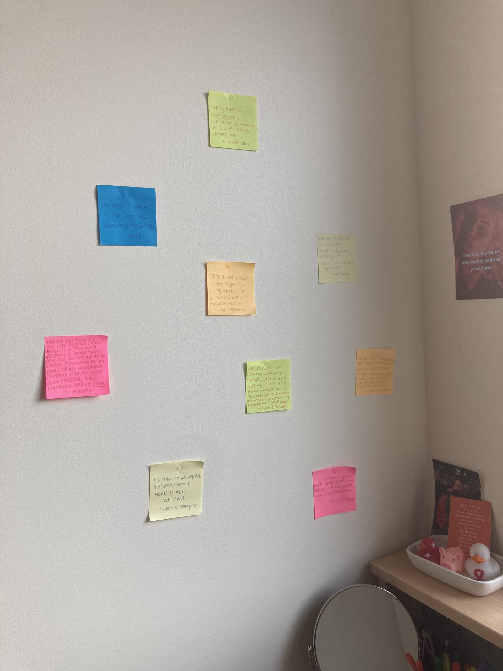 In between the hours of 9-10:30, I have finished decorating my room. I put up more post it notes on my wall. I had previously added my tapestry, my cat poster, and my art piece. As well as Tanner Olson’s poems and some photos I printed out years ago. Tonight, I added a fish made of fish, signaling my IV chapter (and my favorite phrase IV-or-Die-V).