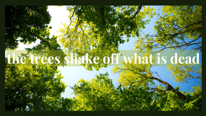 The trees are shaking off what is dead to make room for the living. This is a weird one. That statement isn’t quite true yet. The trees are still green. Fall hasn’t begun to touch their edges. They are clinging to the last vestiges of summer while we wait in eager anticipation of cooler days and cozy nights.