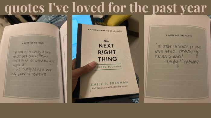 A year ago, I started The Next Right Thing Journal. It has been an AMAZING tool to keep me reflective over the course of weeks and months as opposed to my daily journal (which I love). Every month requires a quote, and so today I share with you the quotes I’ve loved for 2021 (and … Continue reading quotes I’ve loved for the past year