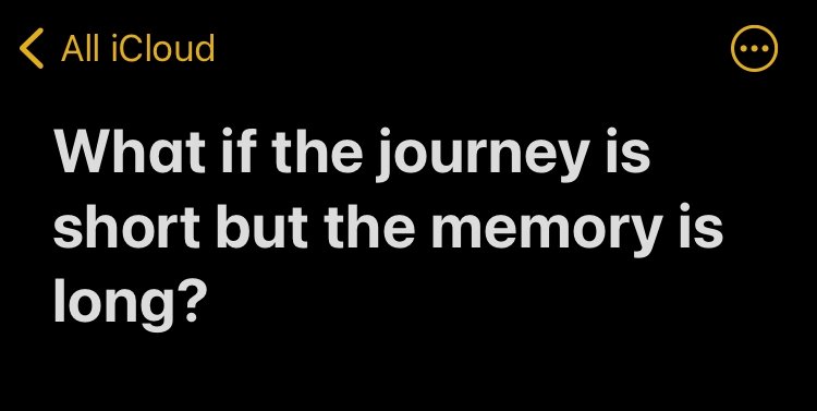 What if the journey is short and the memory is long? This note I wrote to myself has been on my brain as of late. I think I wrote it down on V-Day (which given my thoughts, makes a lot of sense). But how do we reconcile the reality that our lived moments are so short but our reflections on them can last forever? I’ve traced memories in my mind longer than I’ve lived those same moments. And this doesn’t even account for the way that our brain remembers events differently over time. The way we remember changes our memory. Wild! But a different discussion for another day.