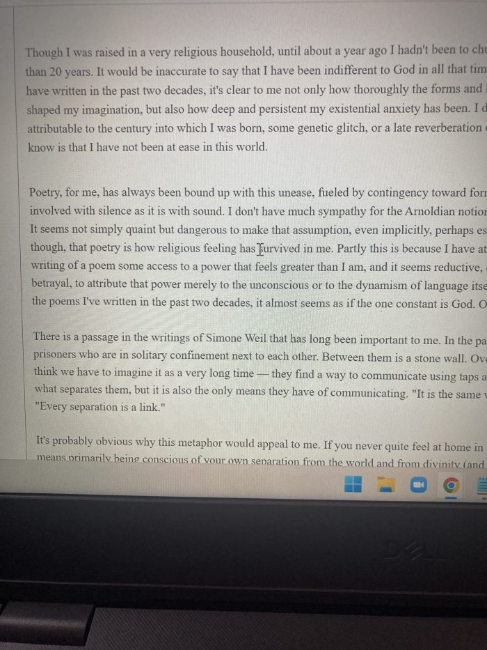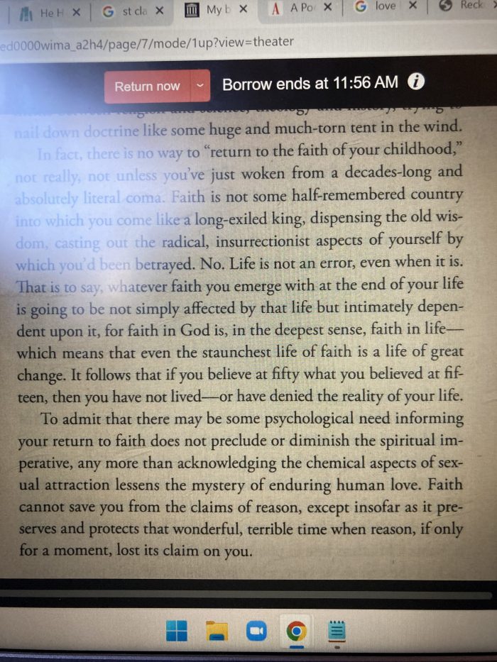 Instead of studying for my exam (I had totally forgotten about that LOL at this point of the day), I started reading My Bright Abyss by Christian Wiman. My nonfiction creative writing professor recommended him, and his work is so great. He’s writing about coming to faith at a pivotal point in his life. He’s received a cancer diagnosis. He’s falling in love. Some of his words are just marvelous.