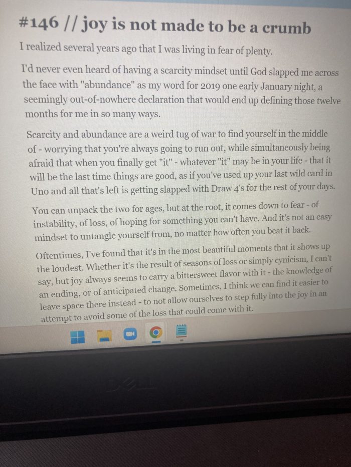 I joined Grace’s Tuesday letters. I was looking for a glimpse of joy, and was slightly surprised to see this talk on abundance and scarcity, which I wrote a little bit about in my last post. I am trying to pay more attention to when words keep repeating themselves to me, and this was one of them.