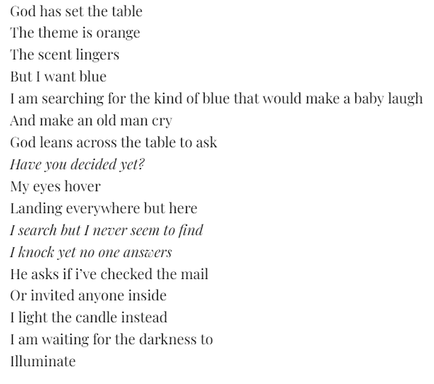 010. I’ve claimed to be a writer, even if it’s just of this blog and the journals I’m always trying to fill. I will share with you some poetry I wrote. I didn’t say it was good, but I’m glad I wrote it anyway.