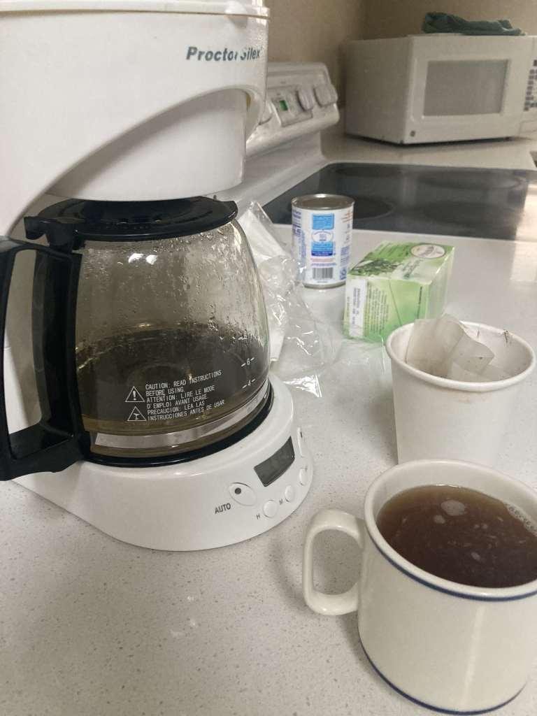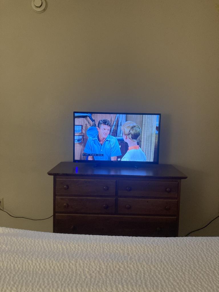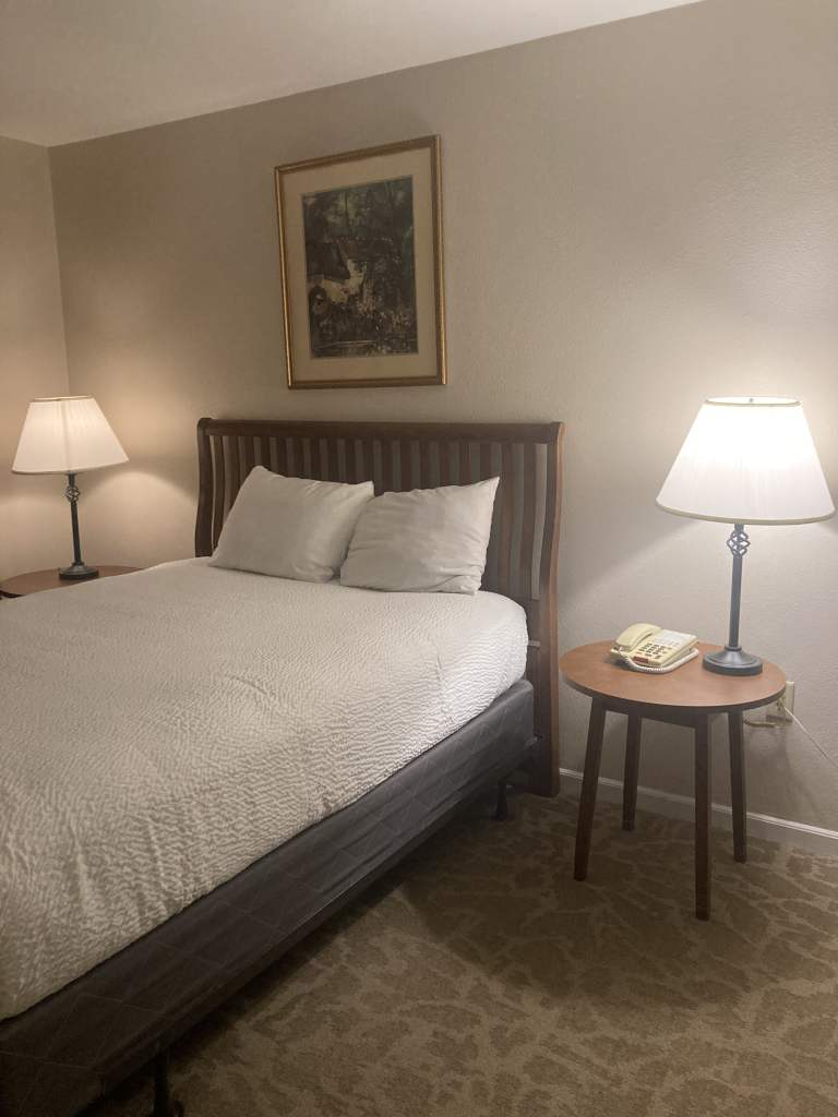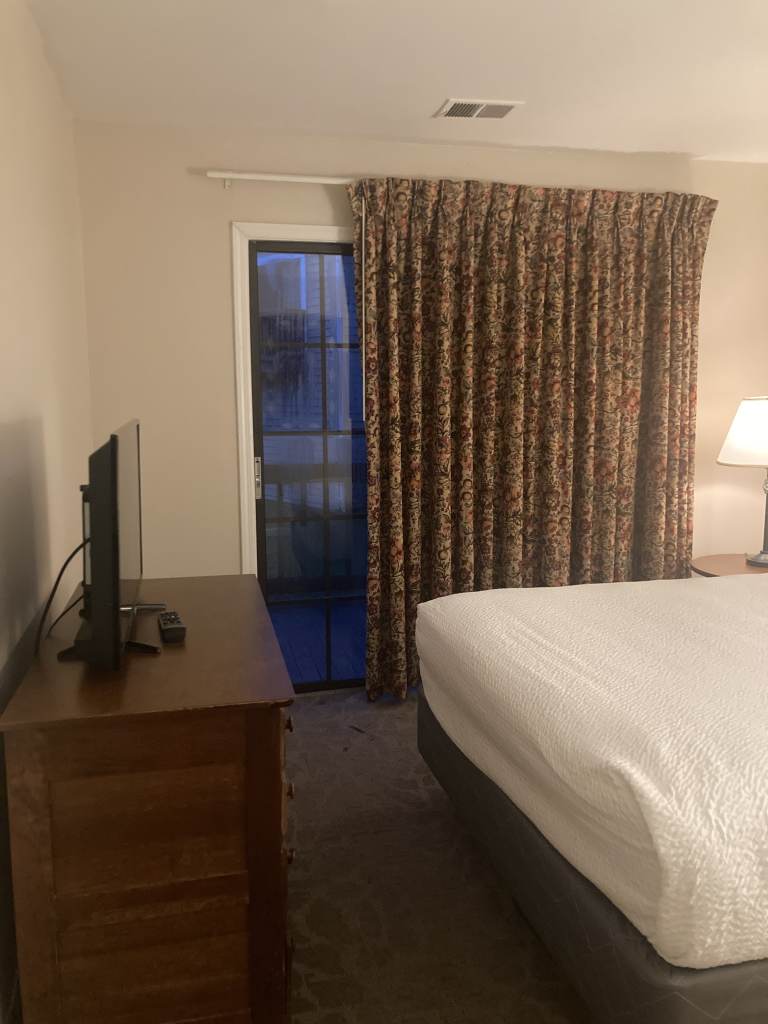 I loved the room I got. It had a little patio (which was honestly the best thing in this vacation). The room had a simple setup. A dresser with a TV on it (only 60 channels). A large king sized bed. Two side tables with two decent-sized lamps. The almost floor-to-ceiling window/door. I have to be honest and say that I had a very simple desire on this vacation: to channel flip and sit outdoors with a book.