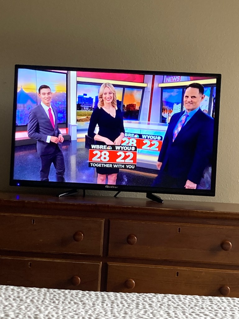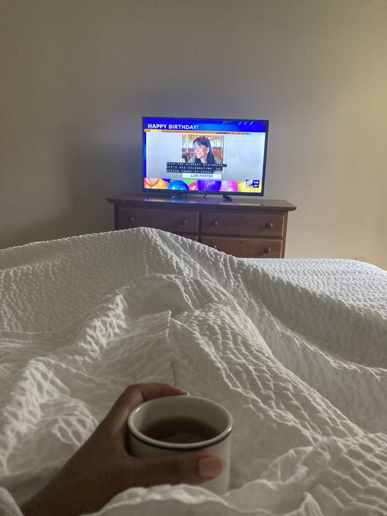 Saturday morning news was delightful too. It was the sunrise segment at 7 in the morning, and I thoroughly enjoyed it. I found out about Musik fest and how popular it is in this region of Pennsylvania. I had ginger tea this morning. The cloudiness continued so I stayed in bed, watching the sweet Happy Birthday segment (so personalized!).