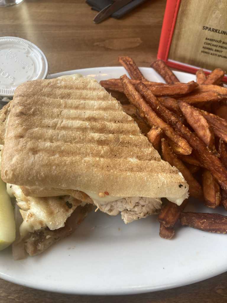 More groundhogs were spotted. Trees were admired and more reading was had. I did see a red robin and red-chested swallow. I’m not a birder, but one day I want to be. For Saturday night’s dinner, I got a panini and more sweet potato fries, and then I curled up outdoors finishing Maggie’s book.