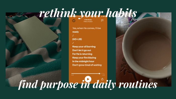 Most mornings I wake up and I open my brown leather Bible, usually a chapter a day and perhaps a commentary on that chapter to gain greater context of the historical and cultural background of what happened in the text. I write in my journal, the blank kind that encourages me to write as big … Continue reading Rethink Your Habits: Find Purpose in Daily Routines