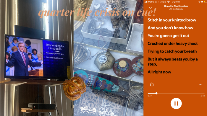 Iβve been feeling kind of off for a few years, and then after a long TikTok scroll, I realized Iβm having a quarter life crisis. The concept of a quarter life crisis isnβt revolutionary, but the idea that ME, Iβm having that quarter life crisis actually is so helpful. Iβm at a point in my … Continue reading my quarter life crisis is right on time!